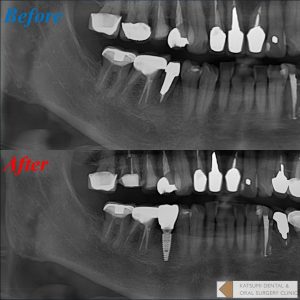 右下5番が保存不可能と言われ、インプラントを希望するも前医では骨がないためできないと断られため当院へ来院された患者さん。同歯は歯根が露出していたためまずは抜歯を先行。抜歯後歯槽骨の欠損に伴い顎堤も大きく陥凹。インプラント周囲に明らかに骨が不足するため、インプラント埋入と同時にGBR法による骨移植術を併用しました。GBR法とは、骨欠損部に骨補填材を充填し、メンブレンという膜で被覆することによって周囲軟組織の侵入を遮断し、骨の再生を図る術式です。当院では更にAFG(Autorogous Fibrinogen Glue)という血液の再生療法を併用しております。インプラント埋入が達成すると共に、歯肉の形態も良好であることはお分かりになると思います。